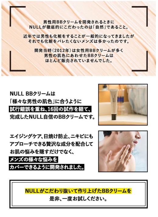 男性用BBクリームの最大のポイントは、ナチュラルに見えること。厚塗り感や不自然な色味は避けつつ、肌の凹凸や色ムラを補正するNULLBBクリームは、オフィスやビジネスシーンでも自然な印象をキープ。自信を持って人前に出られる肌へと導きます。