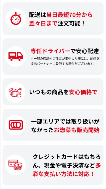 重い荷物を抱えて帰る必要も、混雑したスーパーで並ぶ必要もありません。 スマホから数秒で注文でき、あとは自宅で待つだけ。