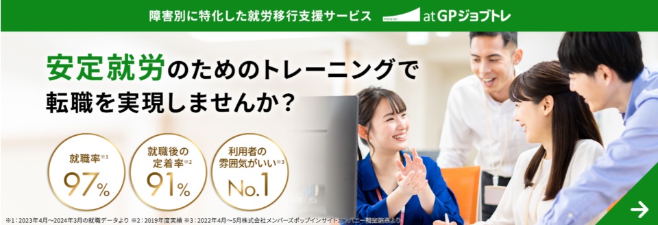 アットジーピーは、障害のある方専門の転職・就職支援サービスとして、多くの求職者と企業をつないできた実績があります。単なる求人紹介ではなく、一人ひとりの状況や希望に寄り添ったサポートが特徴です。