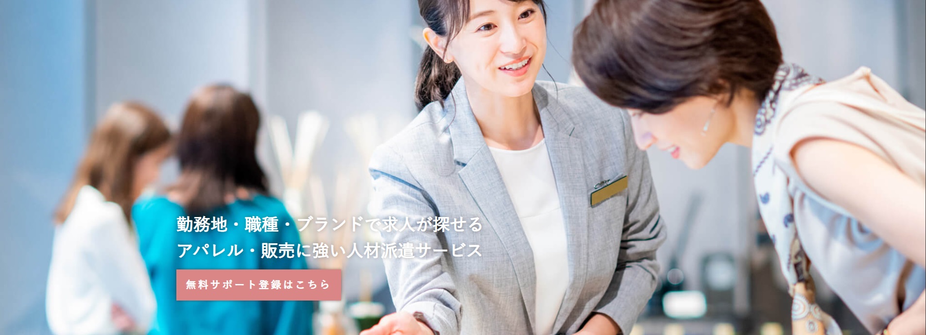 百貨店、商業施設、路面店、アウトレットなど、さまざまな勤務先の求人を取り扱っており、未経験から経験者まで幅広く対応しています。