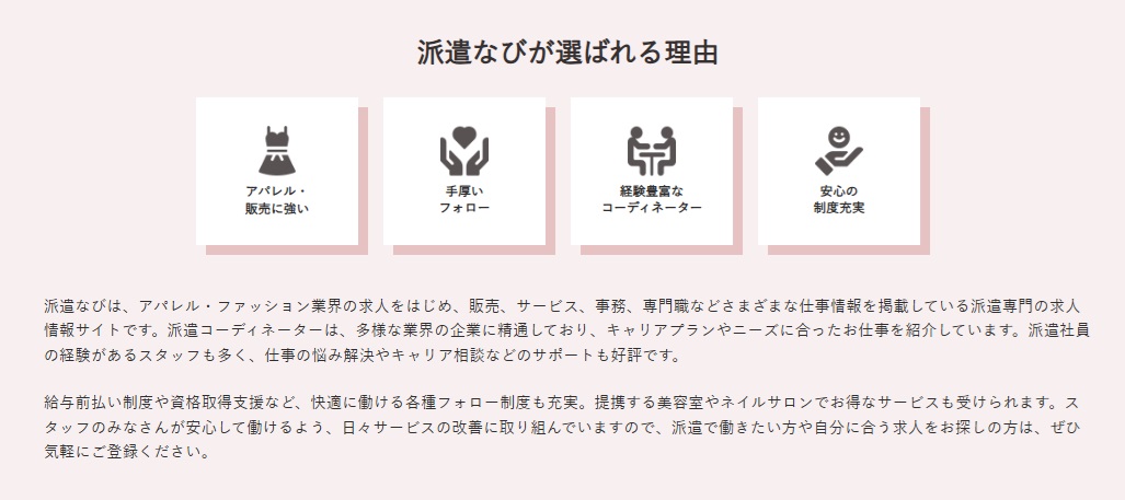 アパレル派遣なびは、ファッション・アパレル業界に特化した求人情報を多数掲載している派遣・転職支援サービスです。