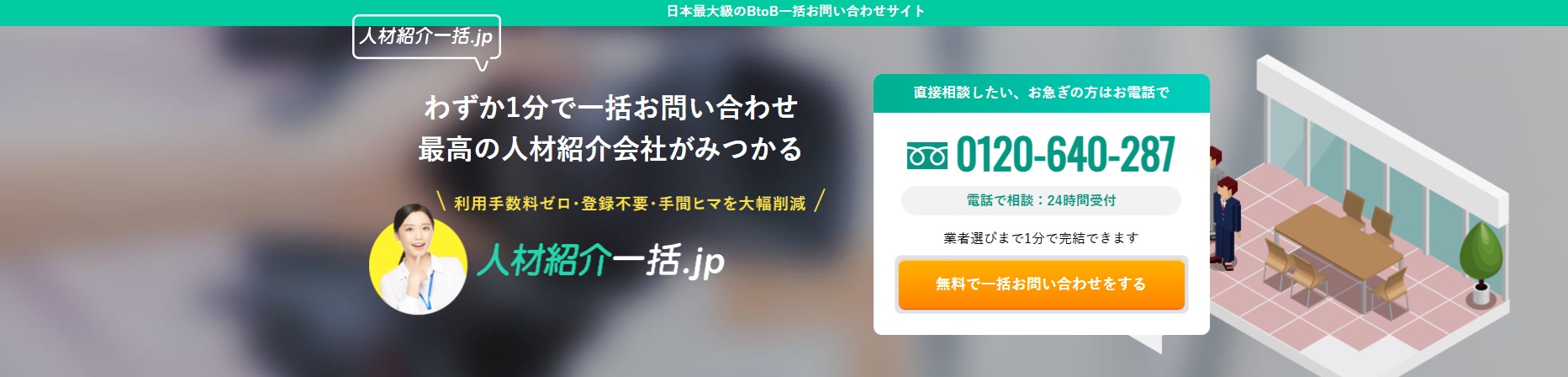 一括.jpは、人材紹介をはじめ、システム開発、Web制作、広告運用など、さまざまな法人向けサービスを無料で一括比較・相談できるプラットフォーム。
