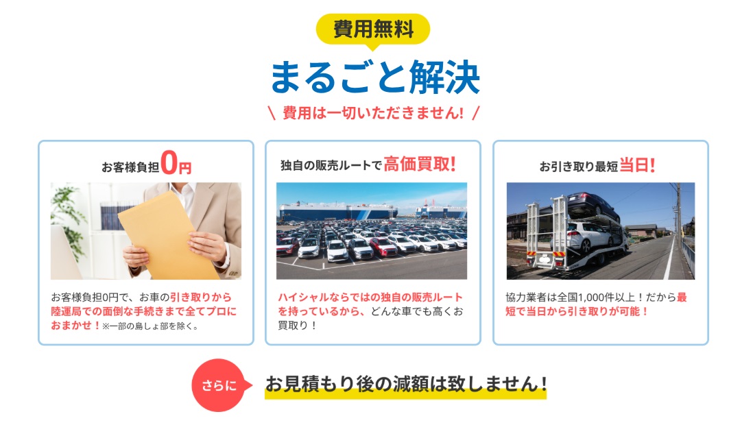 といった点ですが、ハイシャルでは引き取り費用や手数料がかかりません。