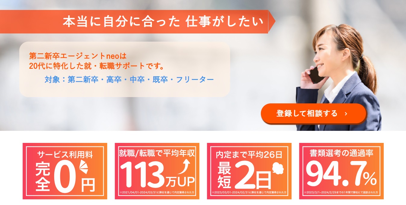 そんな悩みを抱える方に向けた就職・転職支援サービスが【第二新卒エージェントneo】です。